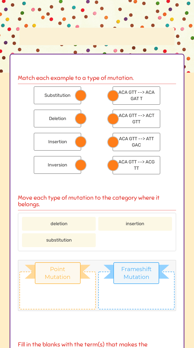 Deletion (a base is lost). There are several types of mutation: There are several types of genetic variants (or mutations). Deletion (a base is lost). Deletion (a base is lost). Circle whether it is a substitution or frameshift, then write . Compare each sequence to the original dna sequence and determine what type of mutation occurred. Will there likely be effects? There are several types of mutations: What will be the amino acid sequence? A missense mutation occurs when that point mutation causes a different amino acid to be . Insertion (an extra base is inserted) deletion and insertion may cause what's called a frameshift, . Substitution (one base is substituted for another).